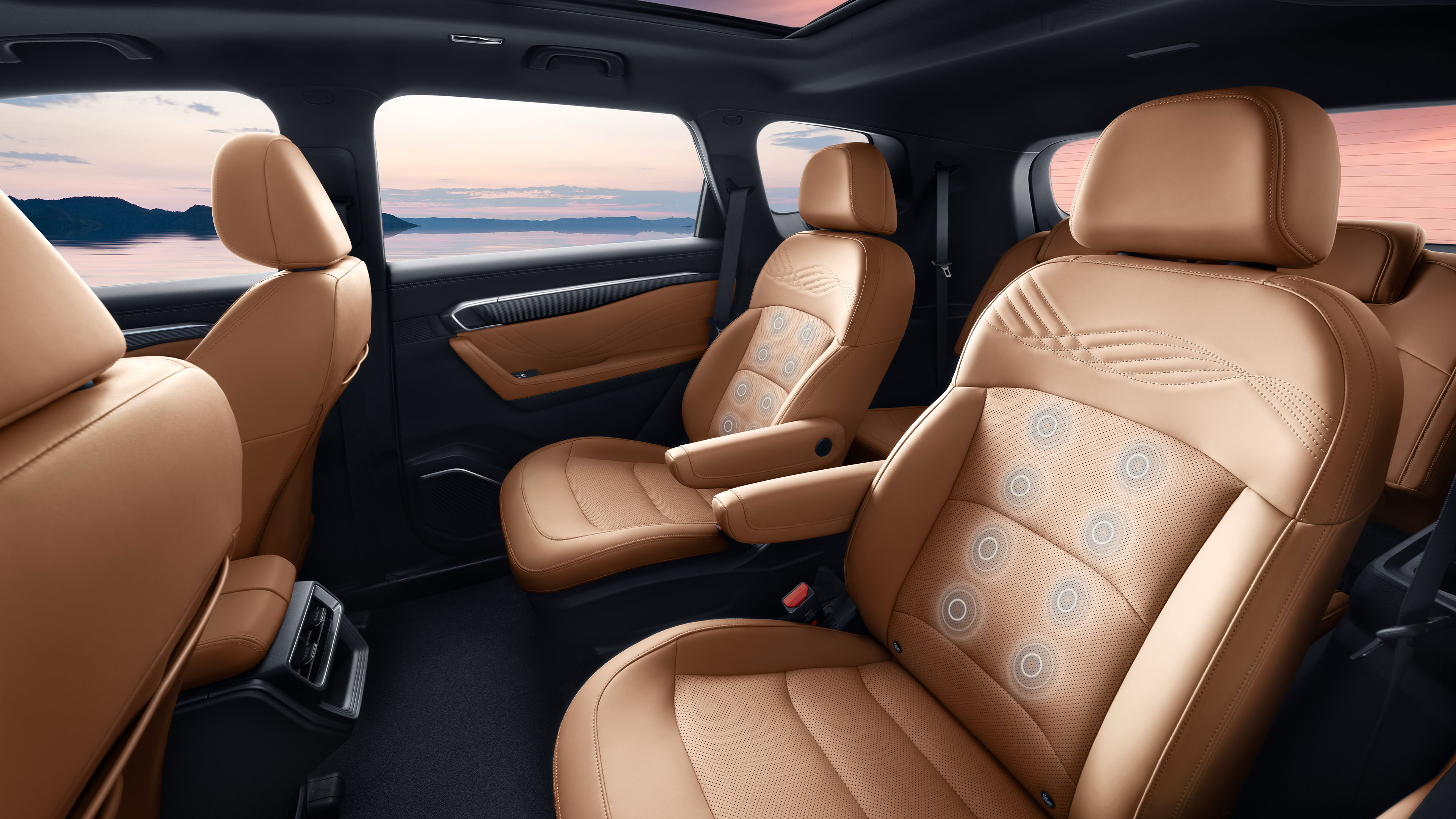 2+2+2座椅,二排179mm中央通道,车内移动不局促;二排标配电调、加热、通风及按摩,乘坐舒适性大幅提高